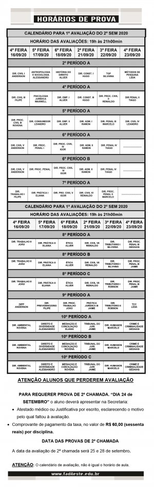 Calendário da 1ª Avaliação do 2º Semestre de 2020